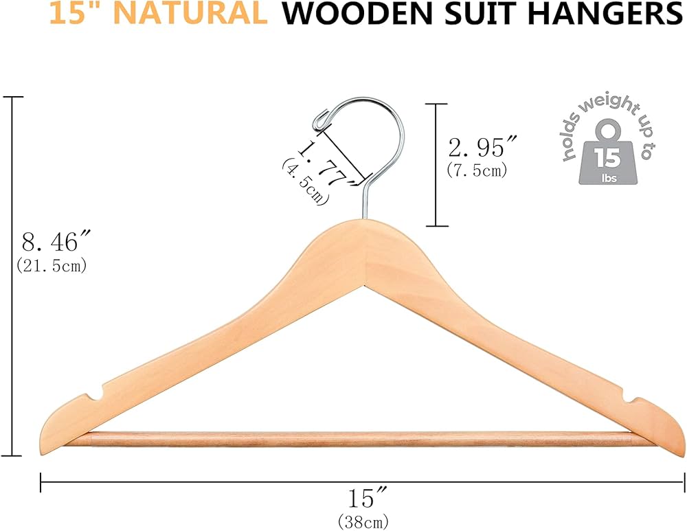 Matériau Bois Dimensions du produit 44L x 23H centimètres Particularités Rotatif, Ergonomique, Antidérapant, Robuste Utilisations recommandées pour le produit Chemisier, Robe, Camisole, Costume, Manteau Cintre en bois naturel de haute qualité : nos cintres sont fabriqués en bois solide et durable, offrant un support solide pour tous les types de vêtements et de pantalons. Design polyvalent pour tous les types de vêtements : parfait pour accrocher des costumes, chemises, vestes, robes, jupes et pantalons. Ces cintres sont idéaux pour garder votre garde-robe bien rangée. Économisez de l'espace dans votre garde-robe : le design fin et compact de nos cintres maximise l'espace dans votre garde-robe, vous permettant de suspendre plus de vêtements dans moins d'espace. Cintres antidérapants : Les encoches sur les barres inclinées et la finition sur la barre horizontale empêchent les vêtements de glisser, les maintiennent en place et évitent les plis. Cintres spécifiques pour pantalons : la barre inférieure avec sa finition antidérapante permet d'accrocher les pantalons de manière efficace et sans plis, facilitant leur rangement et leur entretien.