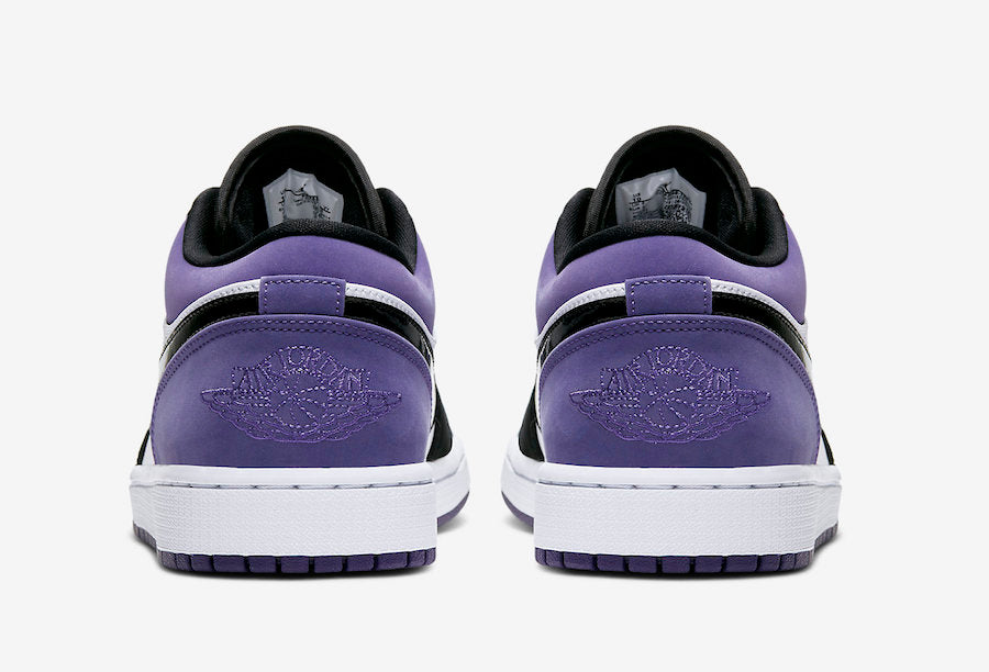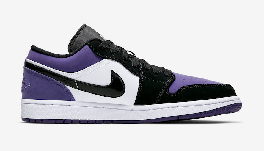 Comme la Air Jordan 1 High Court Purplesortie en 2018, cette version lowtop affiche une conception en cuir blanc contrastée par des empiècements noirs et violets. Le design de Peter Moore est peaufiné par un logo Jumpman blanc sur la languette, une midsole blanche et une outsole noire.