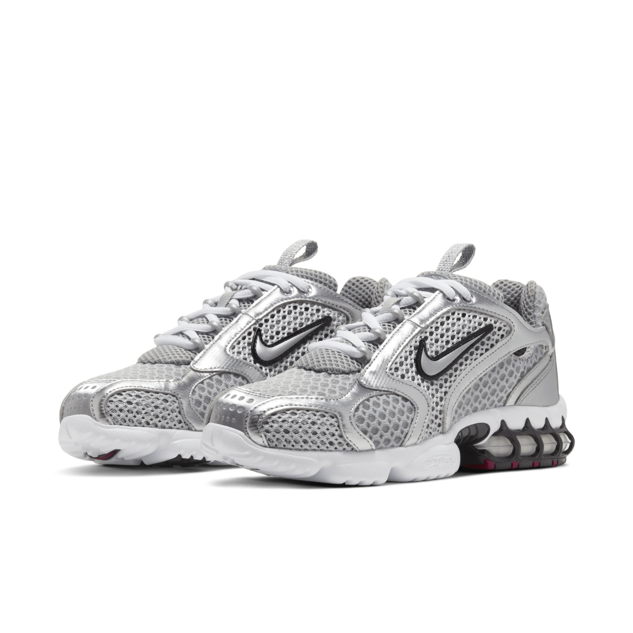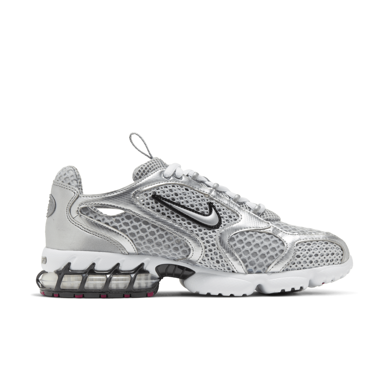 Le futur vous dit quelque chose ? La Spiridon Cage 2 incarne le style du millénaire dans sa plus belle expression. Fidèle au modèle de 2003, la chaussure tient son nom du coussin d'air « en cage » au talon, qui non seulement reflète l'esprit des années 2000, mais offre également la foulée agréable que vous attendez de la technologie Zoom Air. Le coloris Argent métallique met en valeur la structure unique de la chaussure et lui donne un look tout droit sorti d'un défilé de mode cosmique.