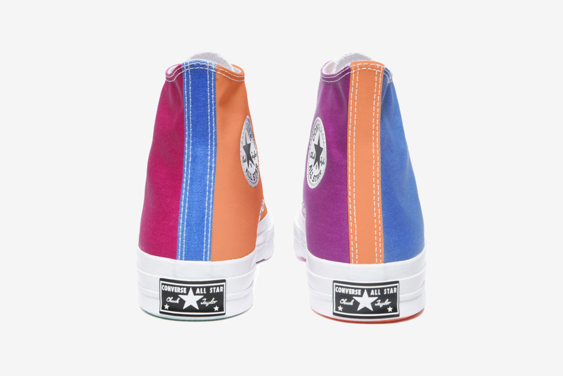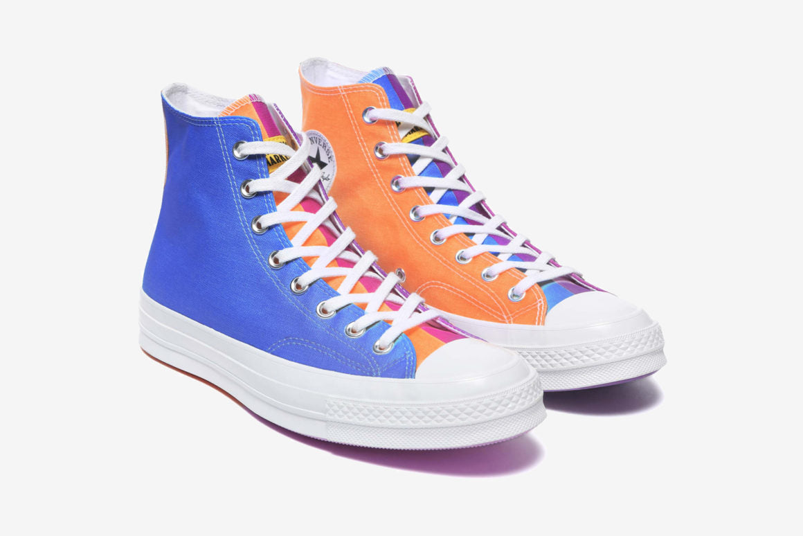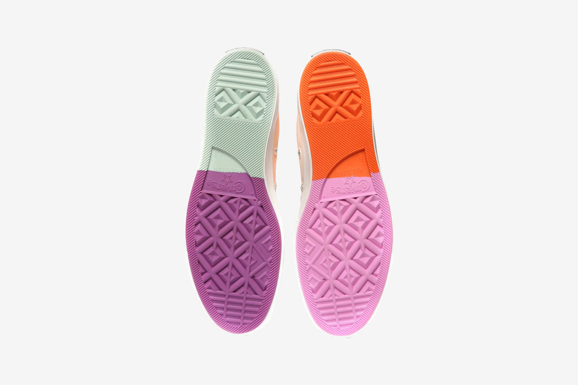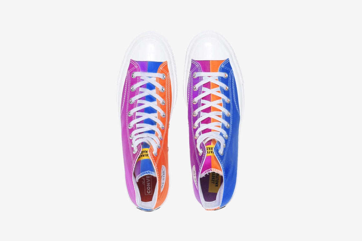 La silhouette est donc composée d’une tige en toile premièrement beige et qui devient multicolore après son exposition aux rayons UV. Parmi les différentes teintes y figurent du bleu, du orange ou encore du violet. Par ailleurs, le tout est conçu dans un effet asymétrique pour plus d’originalité. Le branding Chinatown Market jaune est visible sur la languette du modèle. On le retrouve également sur une des semelles de propreté. La fameux logo Converse All Star est toujours présent sur les côtés intérieurs. Pour finir, l’ensemble prend appui sur une outsole toute aussi colorée. La Converse Chuck 70 High ne sera pas la seule concernée par ce traitement puisqu’elle sera accompagnée d’une version Low.