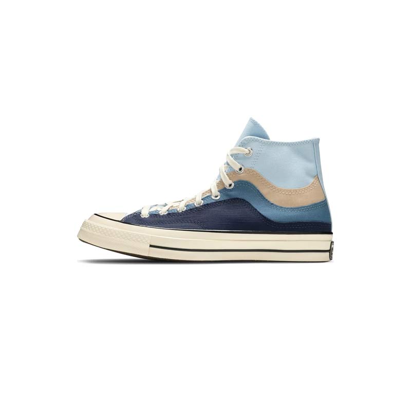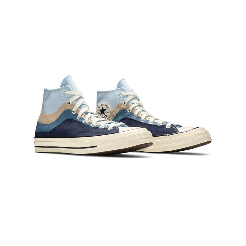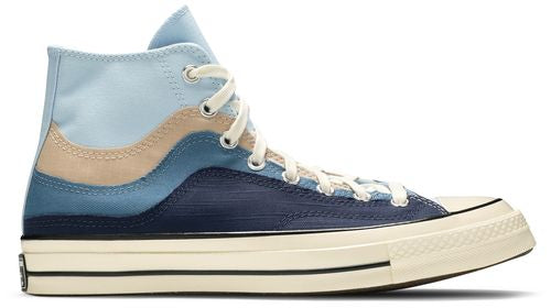 La Converse Chuck 70 High « The Great Outdoors » présente un design superposé inspiré des paysages naturels et de l'interaction de l'eau avec la terre à différentes températures. La tige est confectionnée en toile biologique bleu chambray. Un effet thermique visuel est obtenu grâce à des empiècements enveloppants en ripstop beige, en toile sergée bleue et en toile flammée bleu marine. La tige montante repose sur une semelle intermédiaire en caoutchouc blanc cassé avec des flancs surélevés, comme sur la Chuck 70.