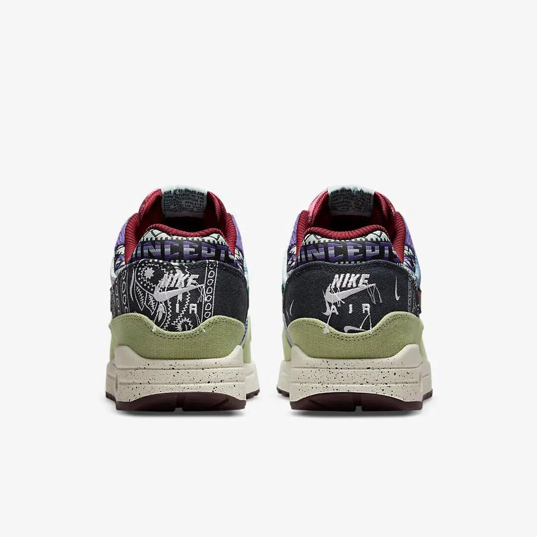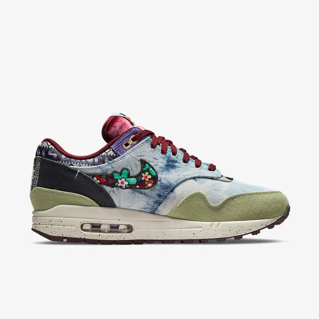 La silhouette de Tinker Hatfied, qui fête son 35ème anniversaire cette année, se pare d’un look haut en couleurs et d’une construction mixte. Celle-ci dispose d’une tige en denim délavé, d’un mudguard en ripstop vert ou encore de différents imprimés sur les talons. On remarque ensuite du velours bordeaux sur la languette, un velours côtélé assorti sur la doublure, ainsi que des lacets ton-sur-ton. Le design est complété par des swooshes dépareillés, des illustrations sur les insoles ou encore par un hangtag en forme de pic de guitare. Un effet speckle sur la semelle vintage, de même qu’une outsole prune, apportent la touche finale.