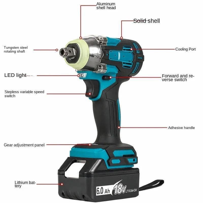 - Design compact et ergonomique: la conception humanisée réduit considérablement la taille de la clé à chocs électrique de 30%, et la poignée améliorée joue un certain rôle dans l'absorption des chocs antidérapante, antichoc et forte.