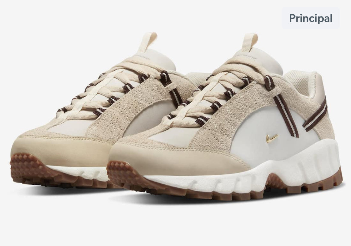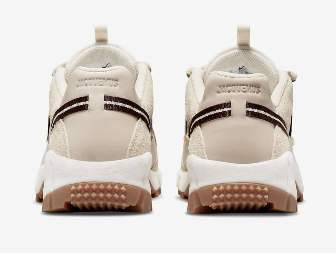 La silhouette combine ainsi une base en cuir blanc sur laquelle est disposé un mini swoosh métallique doré. Elle présente également des superpositions en suede crème et cuir beige. Par ailleurs, le système de laçage s’accompagne de sangles marron et blanche assorties aux ferrets. Le branding Jacquemus, quant à lui, est gaufré sur la languette et le talon. Enfin, une midsole blanche et une outsole gum, dont le design reste fidèle à celui de la Humara, apportent la touche finale. Sachez aussi qu’un second coloris « Brown » sera également disponible.