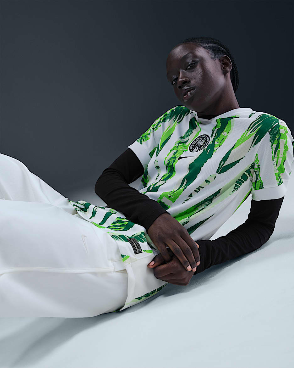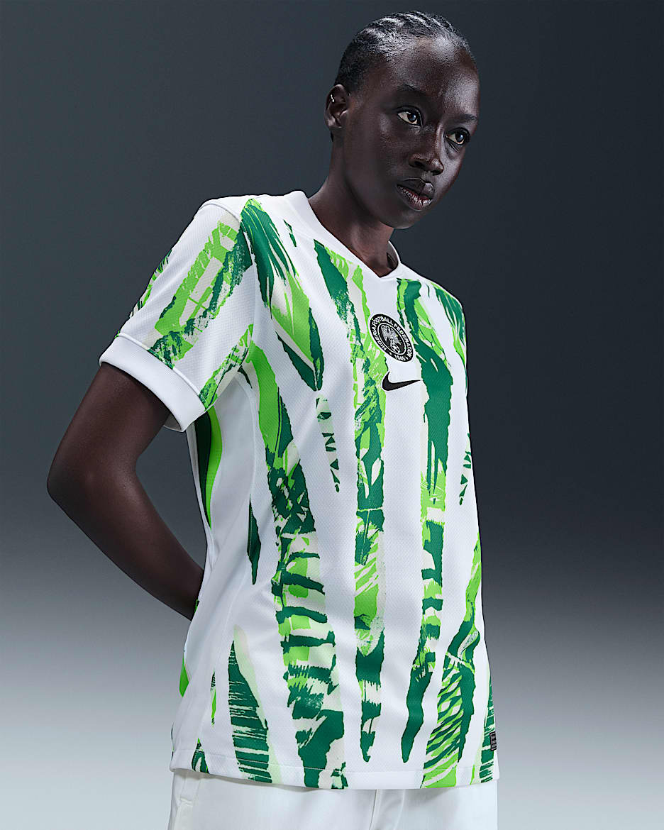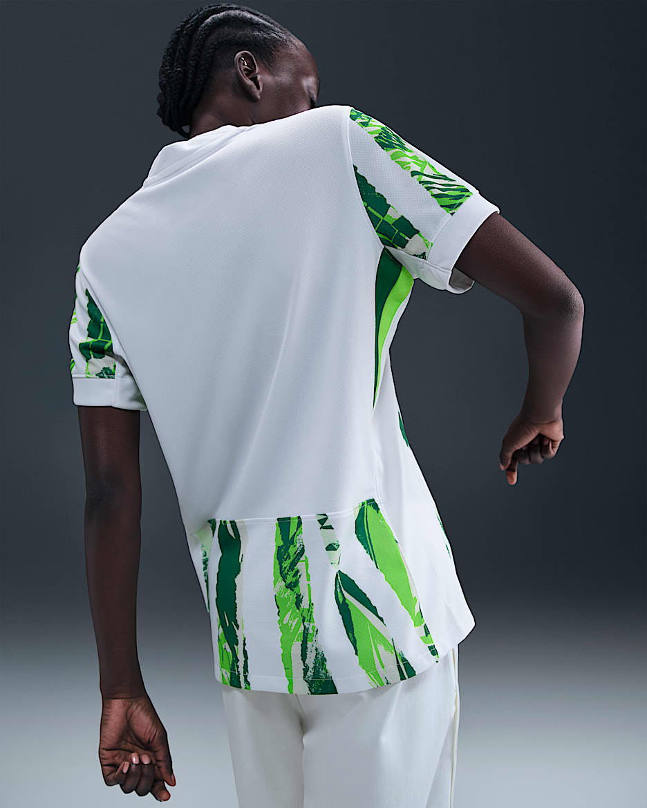 La tenue Nigeria 2025 Extérieur est inspirée des marchés de Lagos et de Sokoto. Rappelant les bandes du drapeau nigérian, les différentes textures dynamiques forment un collage graphique qui célèbre l'éclat et les échanges culturels de ces lieux de rencontre, symboles de diversité et de rassemblement.