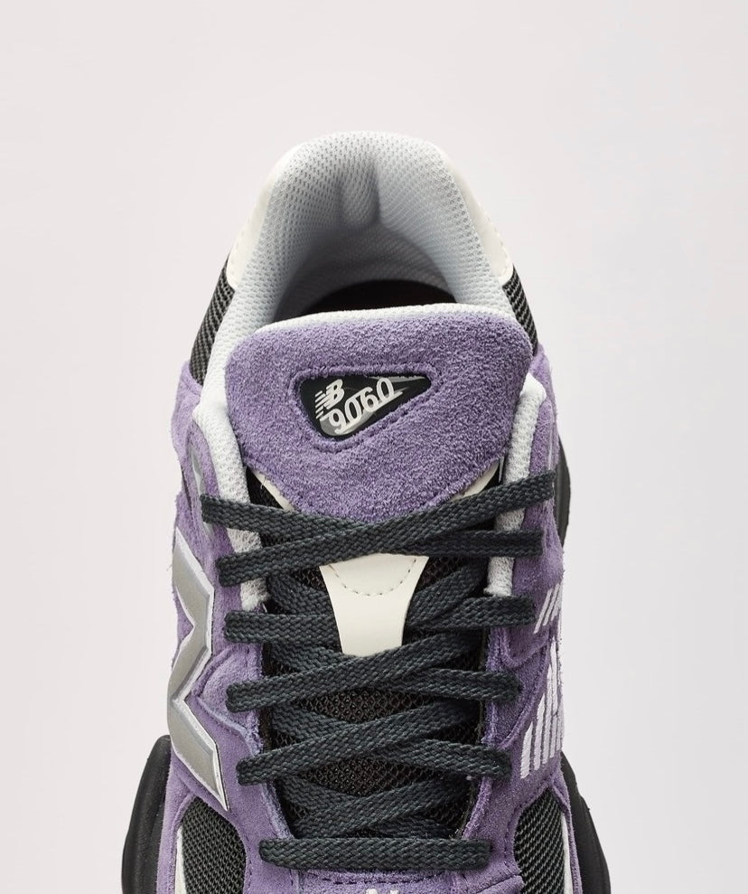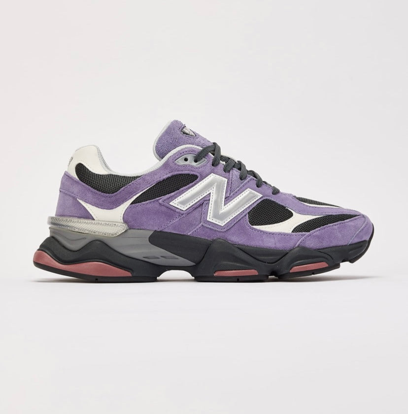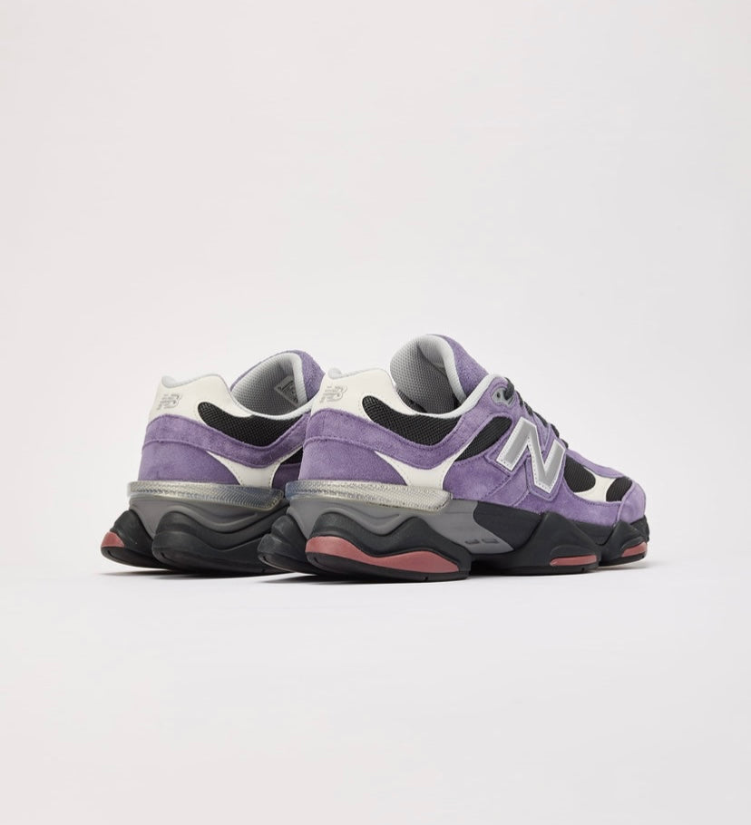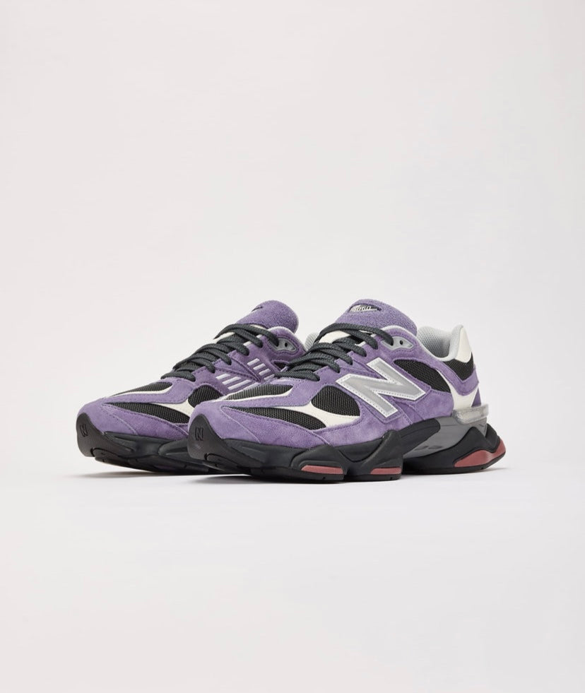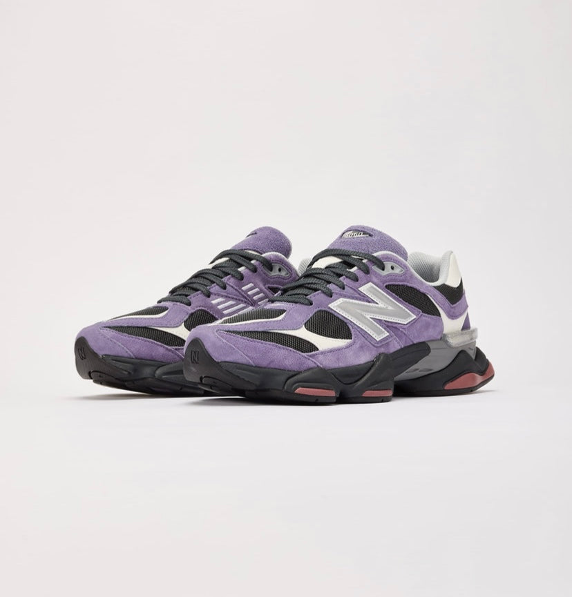 La New Balance 9060 Violet Noir présente une base en mesh noir, accompagnée de superpositions en daim violet et de quelques touches de cuir gris et blanc sur le upper. Au niveau de la semelle, on remarque une association de noir et de gris ainsi que quelques notes bordeaux pour conclure le tout.