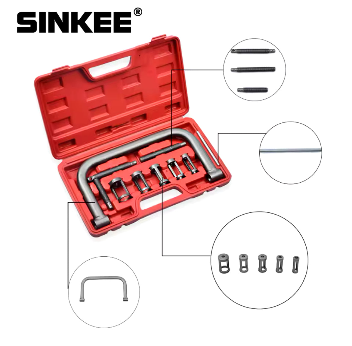 Livré avec 5 adaptateurs pour différents diamètres de ressort, ainsi que pour ajuster correctement le ressort de valve pour une compression facile.